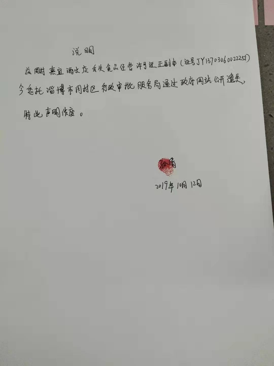 | 周村惠宜酒水店丢失食品经营许可证副本公示 |