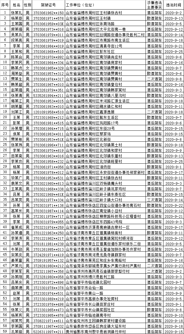 2020年9月份,周村交警大队共查处涉嫌酒驾醉驾违法犯罪人员59人,其中,周村区酒后驾车20人,二次酒驾2人,醉酒驾车9人。