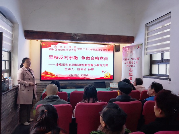 2023年11月15日,周村区科协到党建联系点长安社区,开展了党的二十大精神宣讲活动。活动中,周村区科协党组成员、四级主任科员孙娜同志为参会党员上了一堂题为《坚决反对邪教 争做合格党员》的涉意识形态领域典型案例警示教育专题党课。周村区科协机关全体党员、长安社区党委部分党员共30余人参加了活动。 孙娜同志从案例简介、案例剖析、案例启示三个方面,为大家详细讲解了“党员领导干部搞封建迷信活动事件”和“共产党员参加非法宗教活动事件”2个典型案例,指出理想信念就是共产党员政治生命的基础。党员干部只有在立根固本上下足功夫,才会有强大的免疫力和抵抗力,让一切不严不实、不干不净的东西近不了身、附不了体。共产党员是无神论者,不能信仰宗教,更不能搞封建迷信。反之,不仅会害了自己,更会损害党的事业,危害党的执政基础。 通过案例讲解,警示广大党员干部,无论党龄长短、职务高低,都须臾不能放松党性修养,不能淡忘初心使命,必须时刻保持理论上的清醒、政治上的坚定,自觉抵制错误思潮的侵蚀,始终做老实人、说老实话、干老实事,做忠诚干净担当的好干部。 周村区科协 2023年11月17日 |