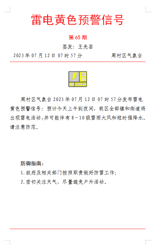 雷电黄色预警信号第65期