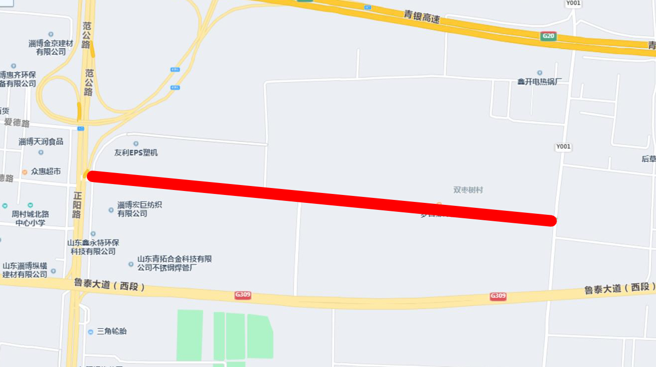 道路1:该道路东西方向,位于双枣村委以南,鲁泰大道以北,东起苏袁路,西至正阳路,长约1500米,宽21米。