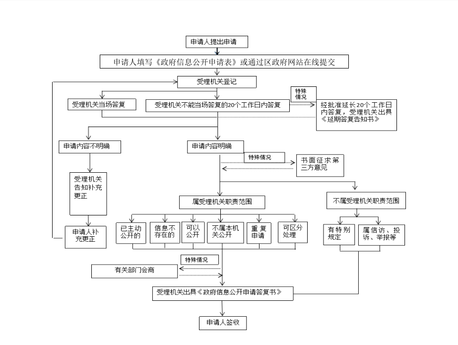 各工作不忙办理申请人政府信息公开申请时,能够当场答复的,将当场答复;不能当场答复的,自收到申请之日起20个工作日内予以答复;确需延长答复期限的,延长答复时间不超过20个工作日,并告知申请人。政府信息涉及第三方权益的,应当征求第三方的意见,征求第三方意见所需时间不计算在期限内。