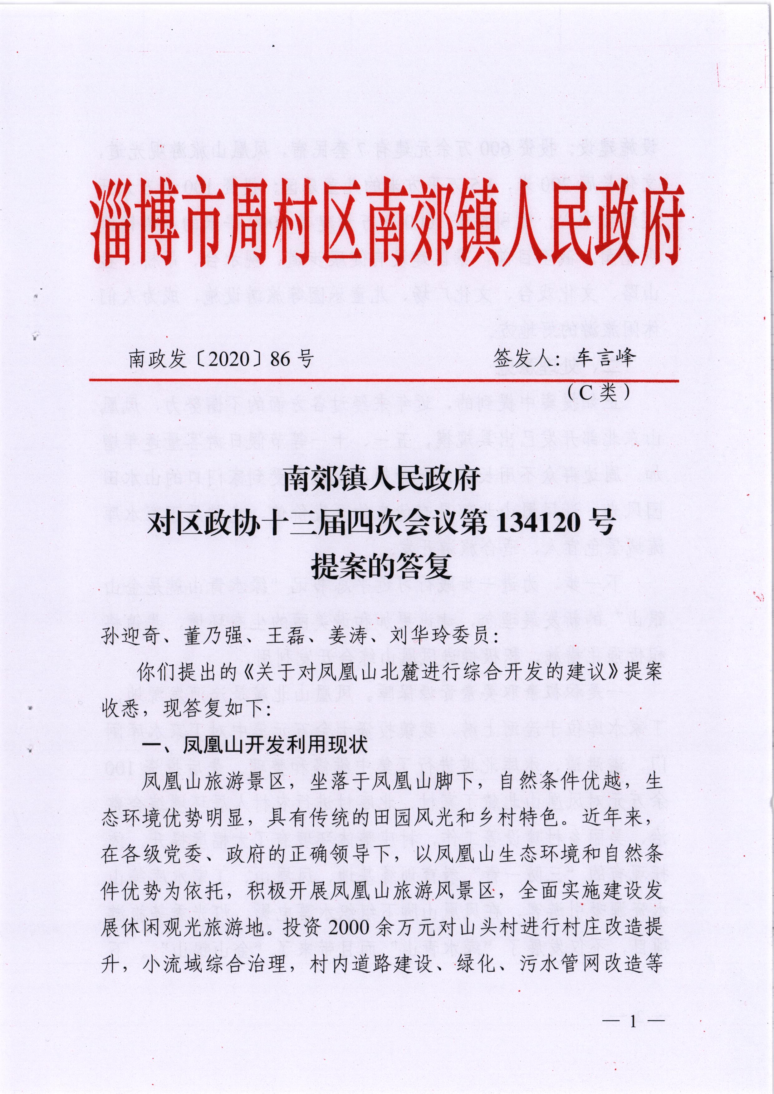 关于区政协十三届四次会议第134120号提案的答复(关于对凤凰山北麓进行综合开发的建议)