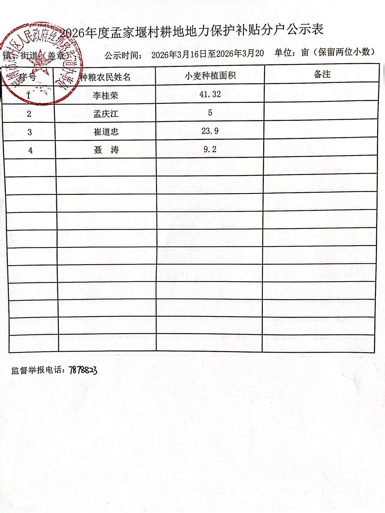 周村区丝绸路街道2026年度耕地地力保护补贴发放公示