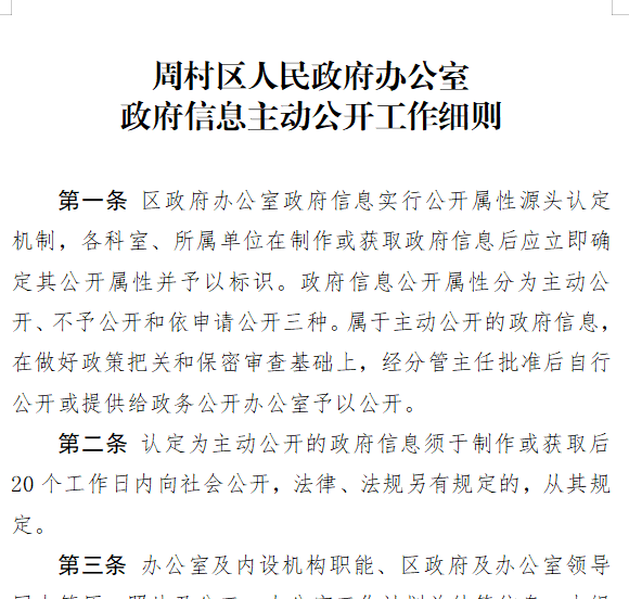 《周村区人民政府办公室政府信息公开指南》(以下简称《指南》)由区政府办公室根据《中华人民共和国政府信息公开条例》(国务院令第492号公布,国务院令第711号修订,以下简称《条例》)编制。需要获得本机关政府信息公开服务的公民、法人或者其他组织,建议阅读本《指南》。公民、法人或者其他组织可在周村区人民政府网站(www.zhoucun.gov.cn)查阅本指南。本指南根据需要及时更新。
