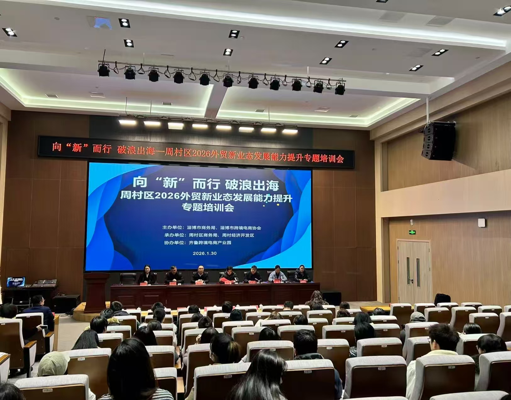 1月30日,在周村经济开发区组织举办向"新"而行 破浪出海一周村区2026外贸新业态发展能力提升专题培训,帮助外贸和跨境电商企业更好地应对税务及财务等相关变化,同时更好地运用社交媒体开拓国际市场,增强企业竞争力。淄博市商务局党组成员、副局长牛广牧及服务贸易科主要负责同志到会指导,区委常委、副区长李建华致辞,周村区商务局、周村经济开发区主要负责同志、各镇办分管负责同志以及全区30余家外贸企业参加培训。