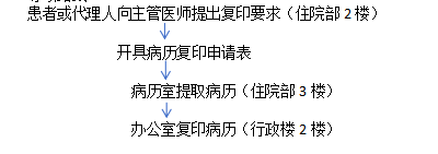 患者或代理人向主管医师提出复印要求,主管医师确定同意后,开具病历复印申请表(注明患者姓名、性别、年龄、住院号及医师签名),患者或代理人携带病历申请复印单及所需证明材料到病历室复印病历,并向工作人员说明复印用途。