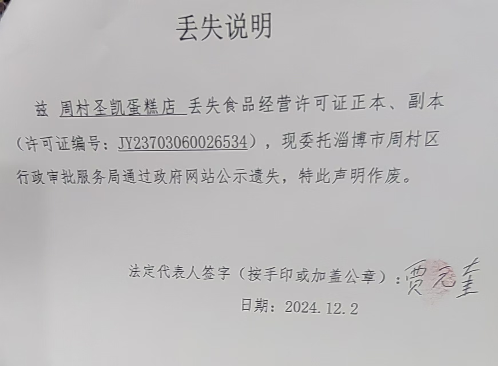 周村圣凯蛋糕店丢失食品经营许可证正本、副本