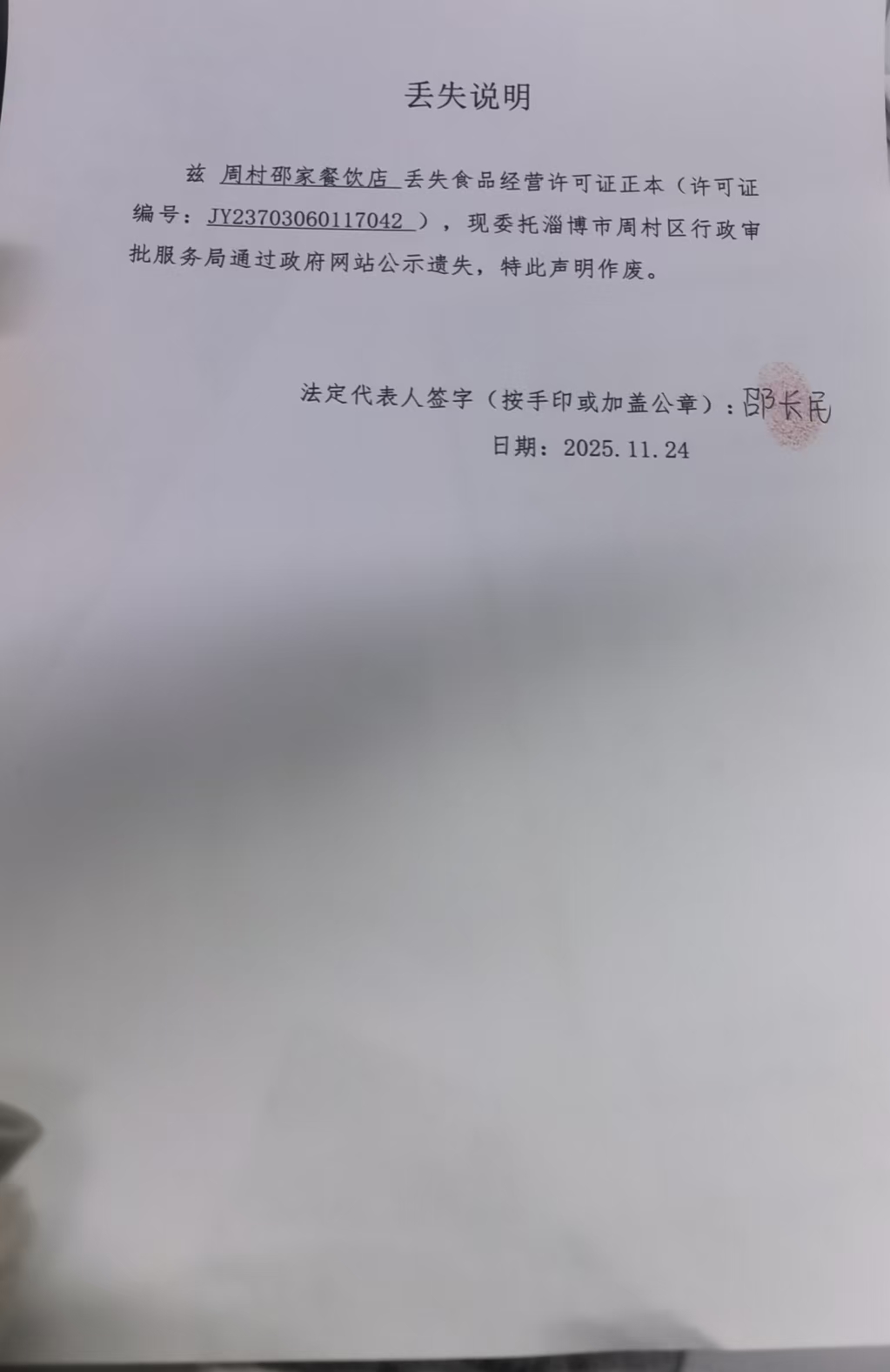 周村邵家餐饮店丢失食品经营许可证正本