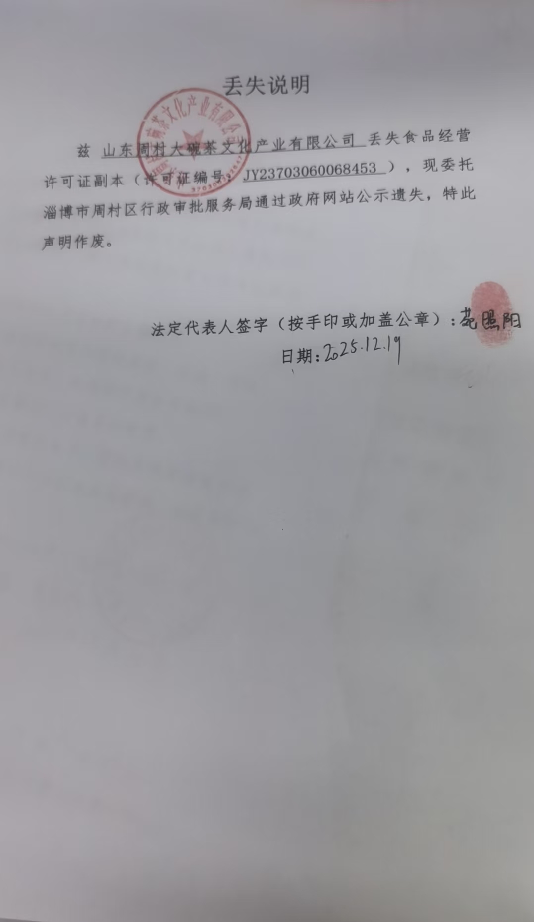 山东周村大碗茶文化产业有限公司丢失食品经营许可证副本