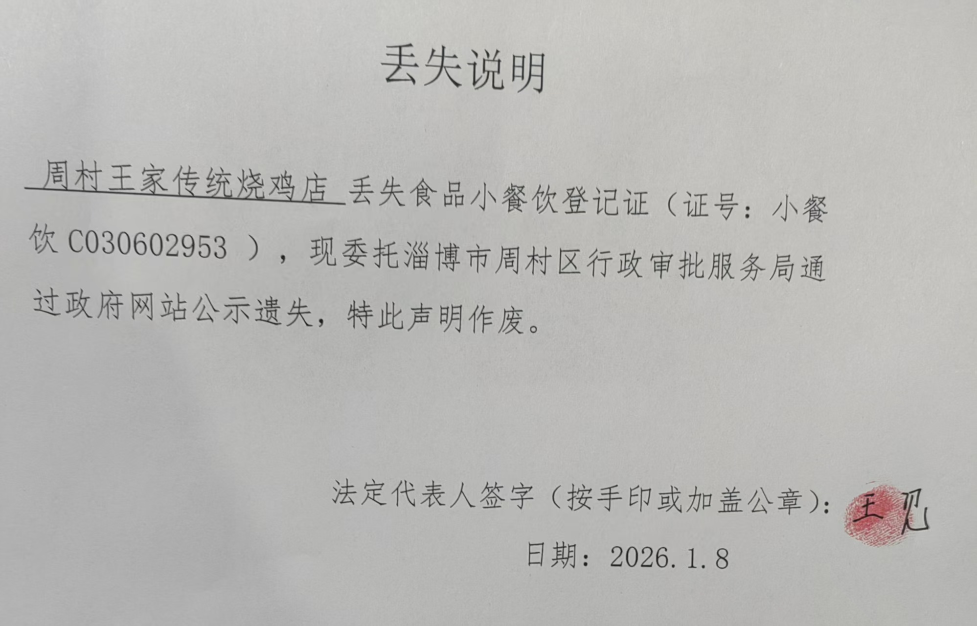 周村王家传统烧鸡店丢失食品小餐饮登记证