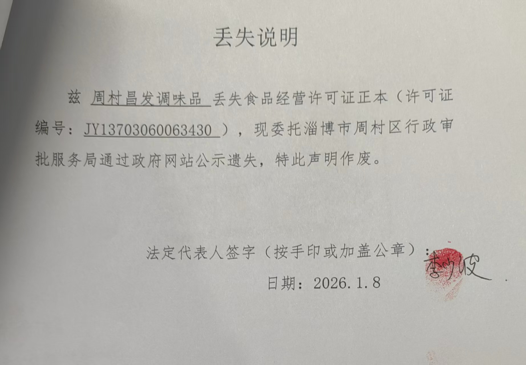 周村昌发调味品丢失食品经营许可证正本