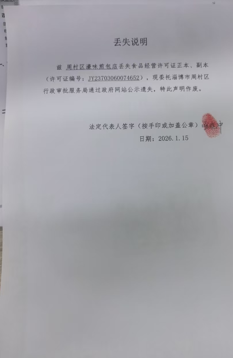 周村区濠味煎包店丢失食品经营许可证正本,副本