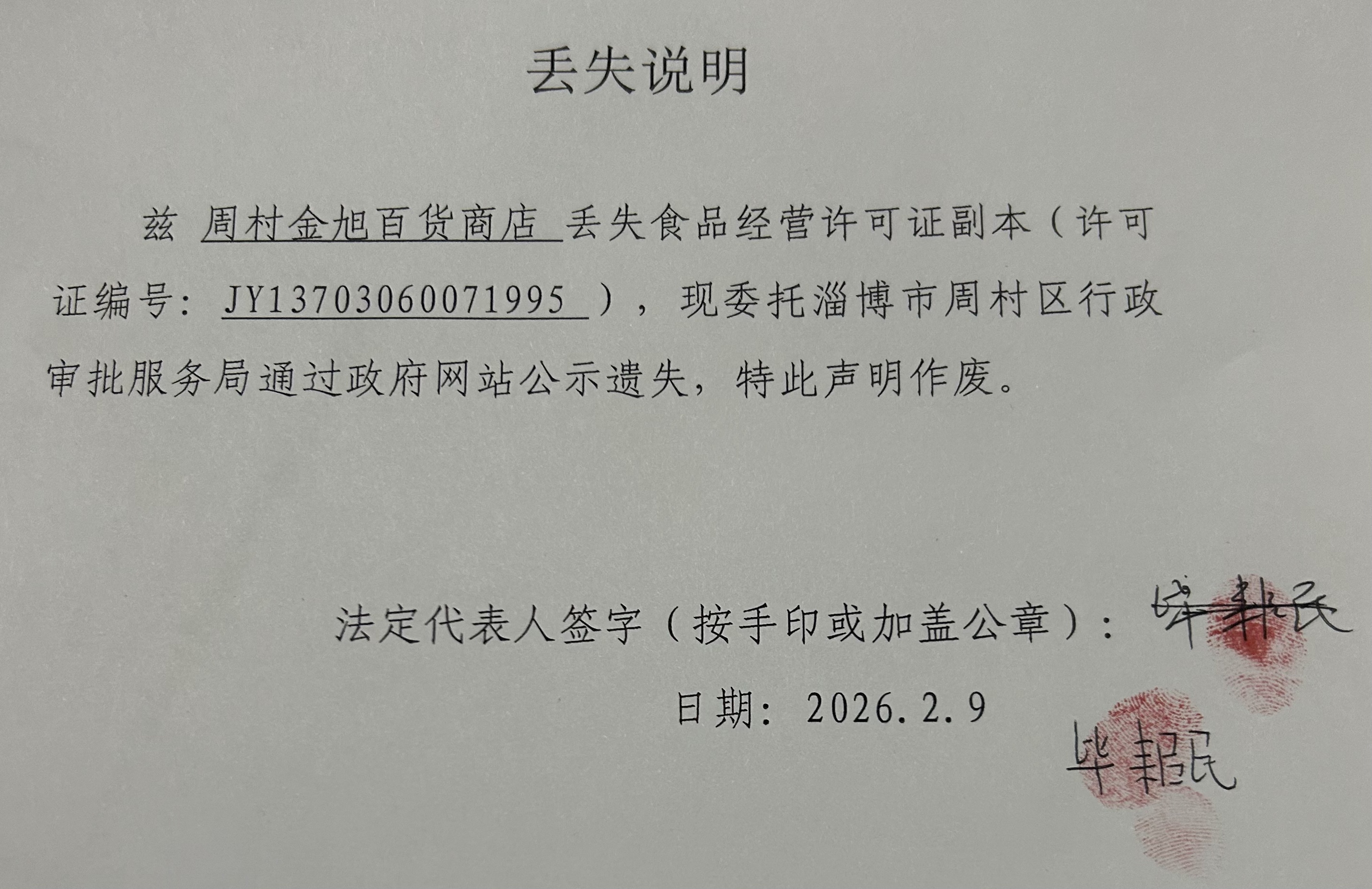 周村金旭百货商店丢失食品经营许可证副本