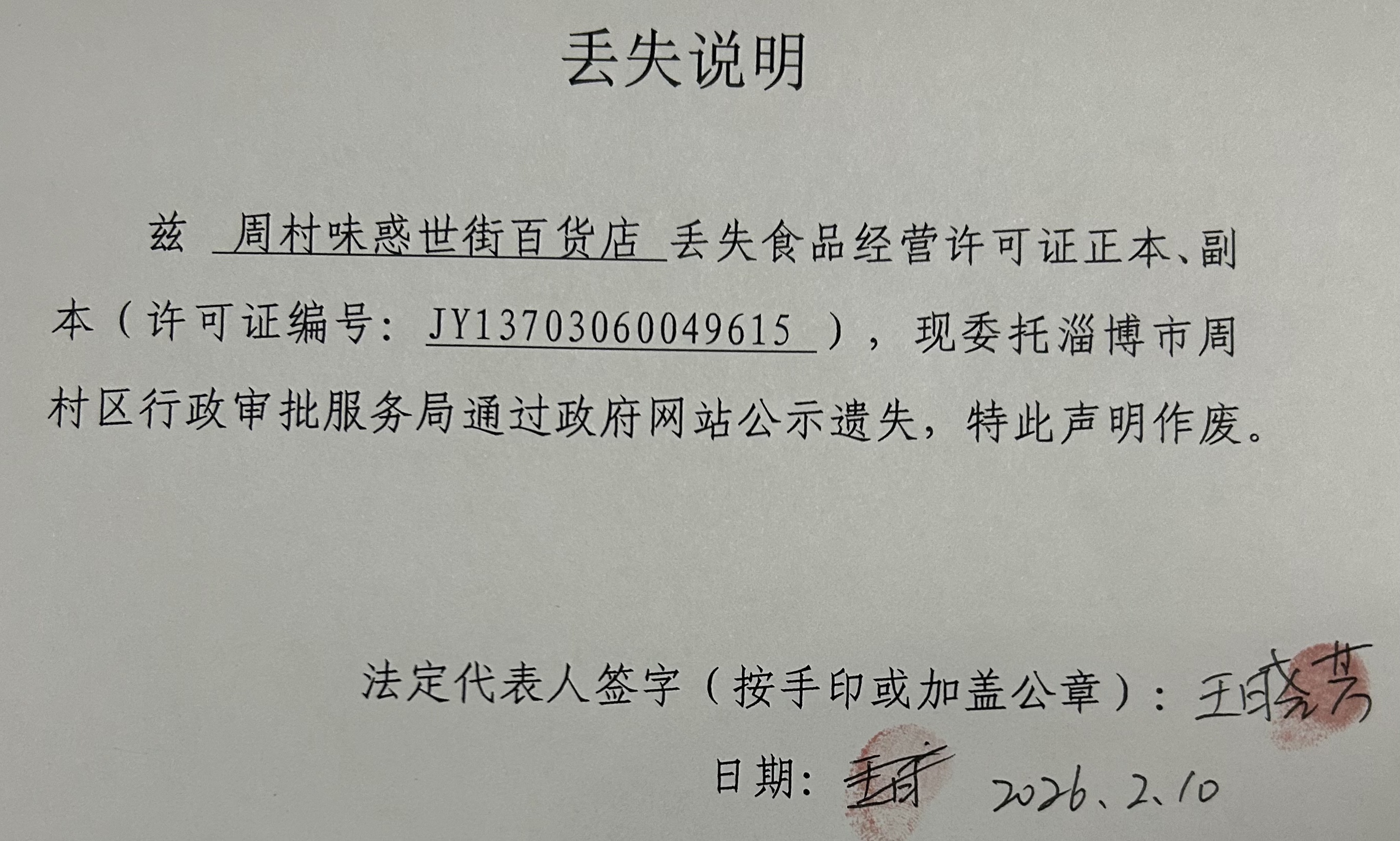 周村味惑世街百货店丢失食品经营许可证正本、副本