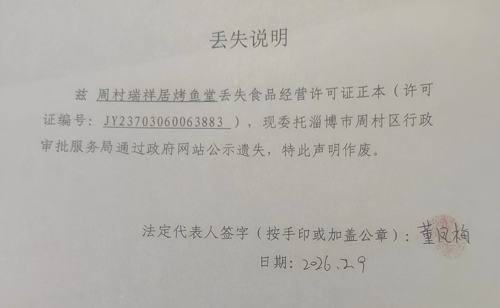 周村瑞祥居烤鱼堂丢失食品经营许可证正本
