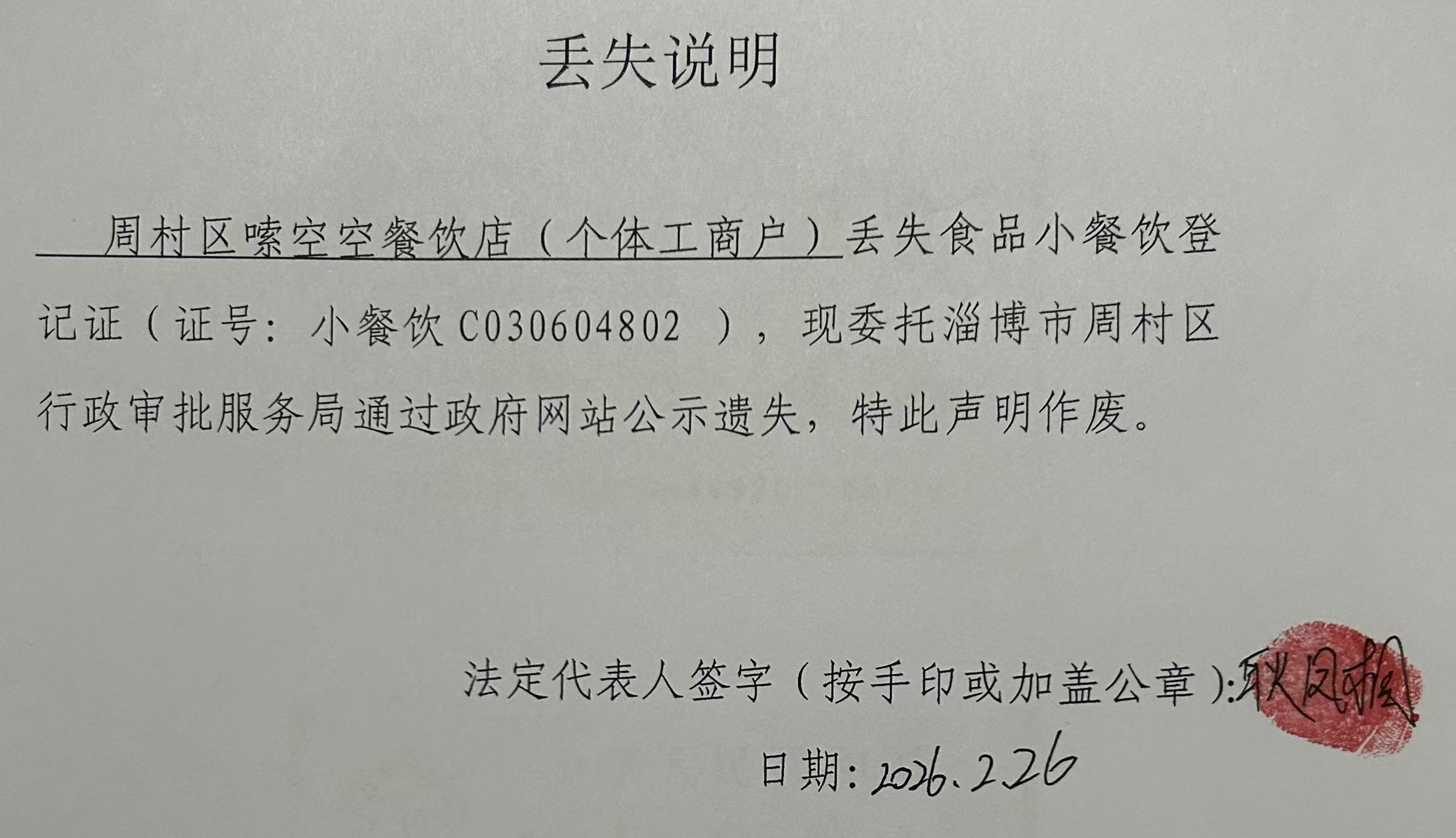 周村区嗦空空餐饮店丢失食品小餐饮登记证