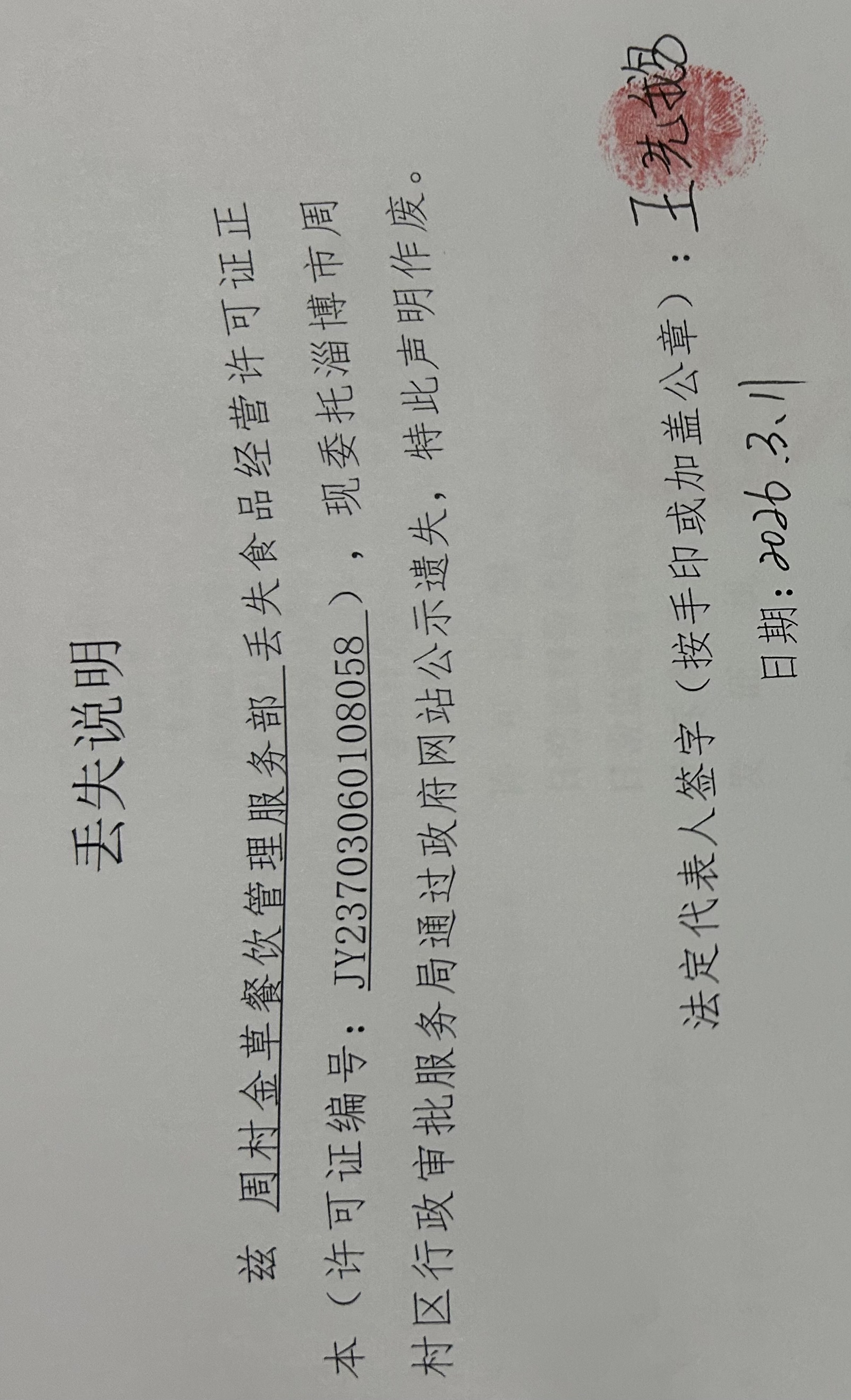 周村金草餐饮管理服务部丢失食品经营许可证正本