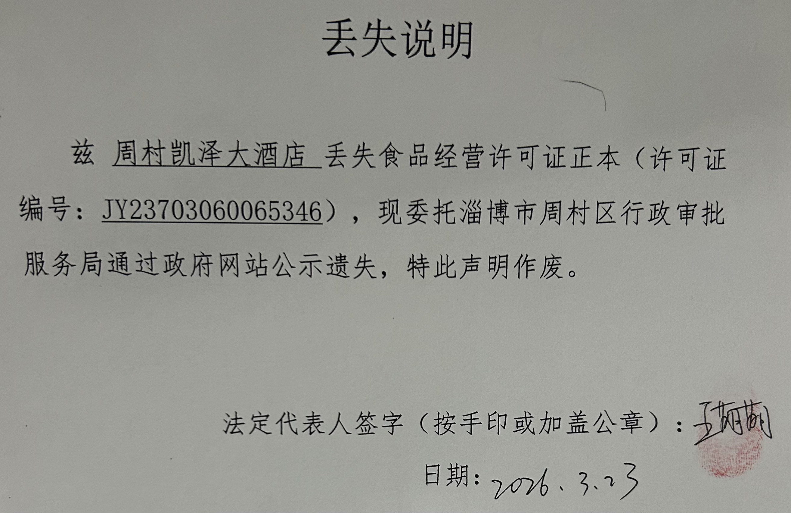 周村凯泽大酒店丢失食品经营许可证正本