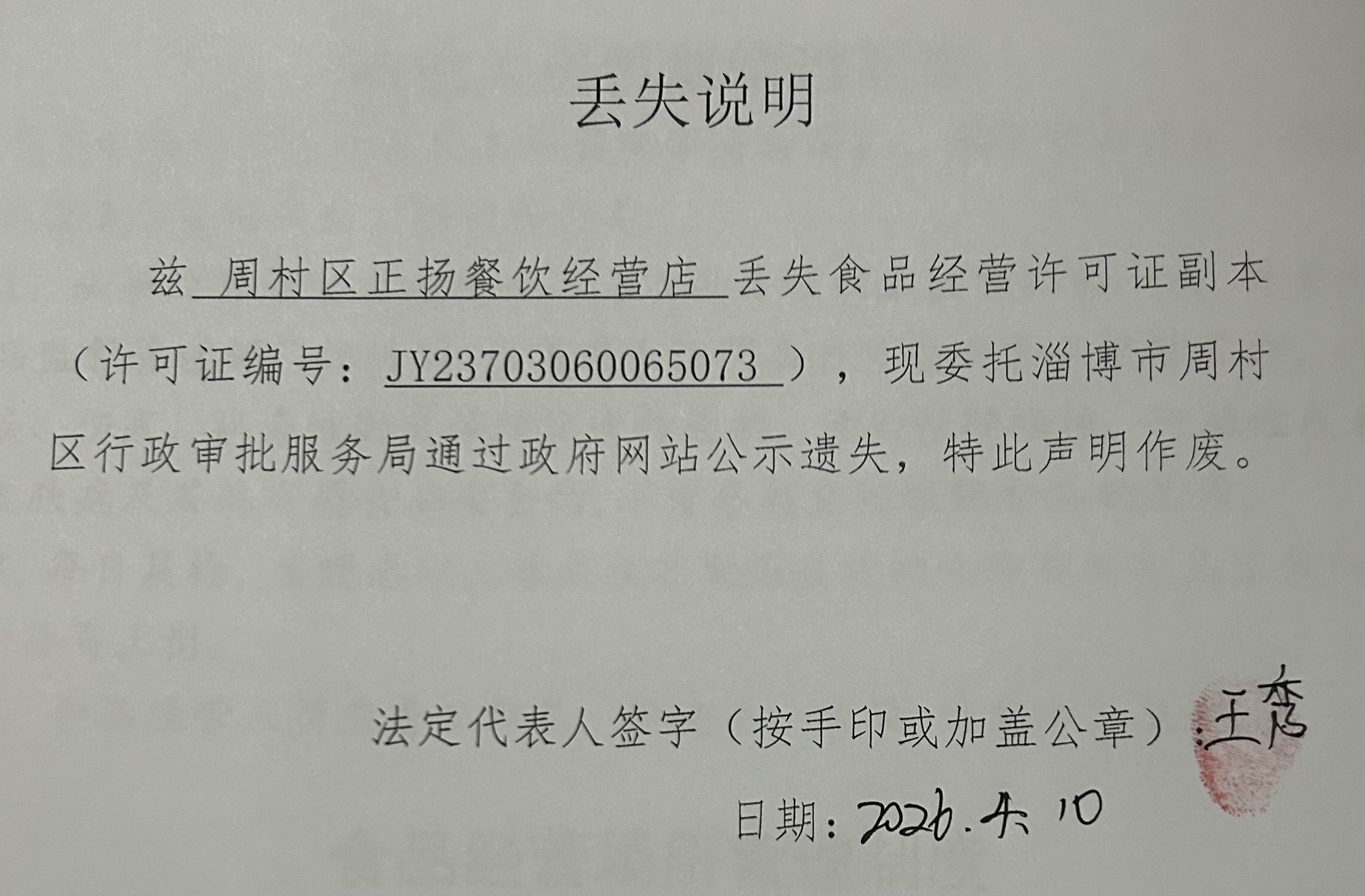 周村区正扬餐饮经营店丢失食品经营许可证副本