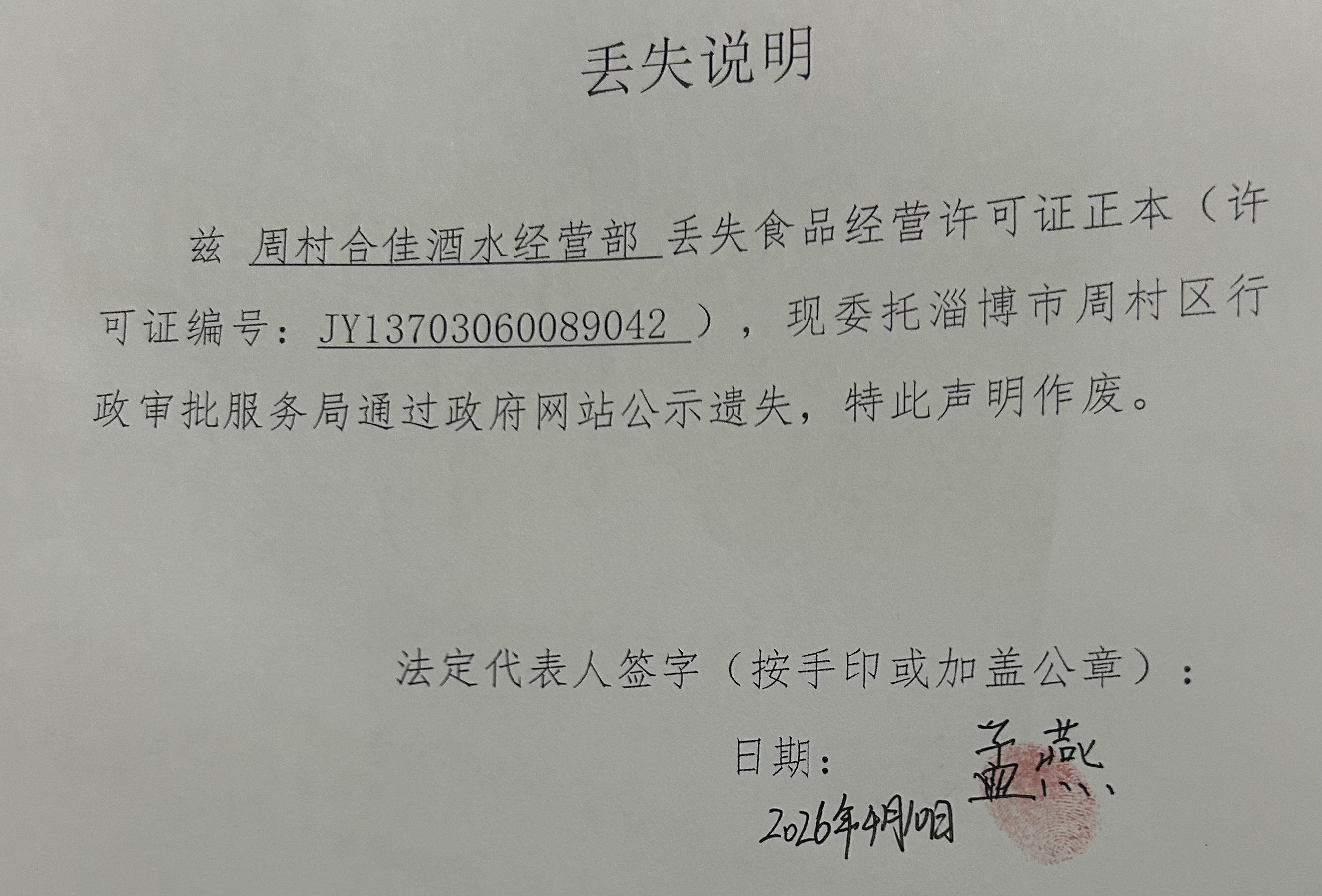 周村合佳酒水经营部丢失食品经营许可证正本