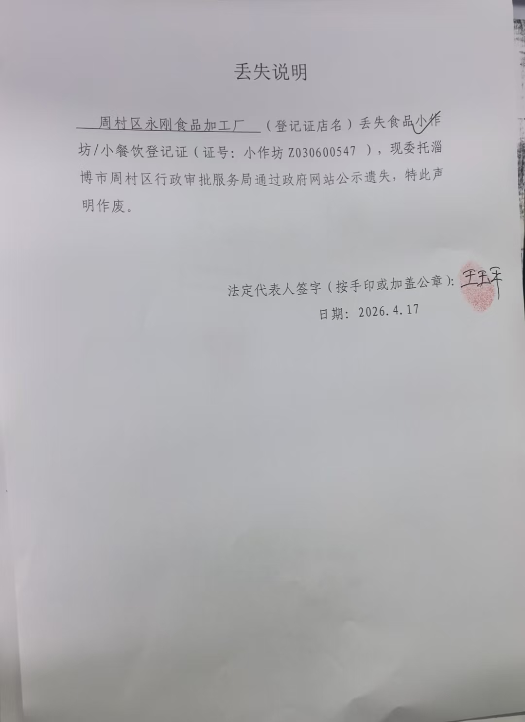 周村区永刚食品加工厂丢失食品小作坊登记证(证号:小作坊 Z030600547)