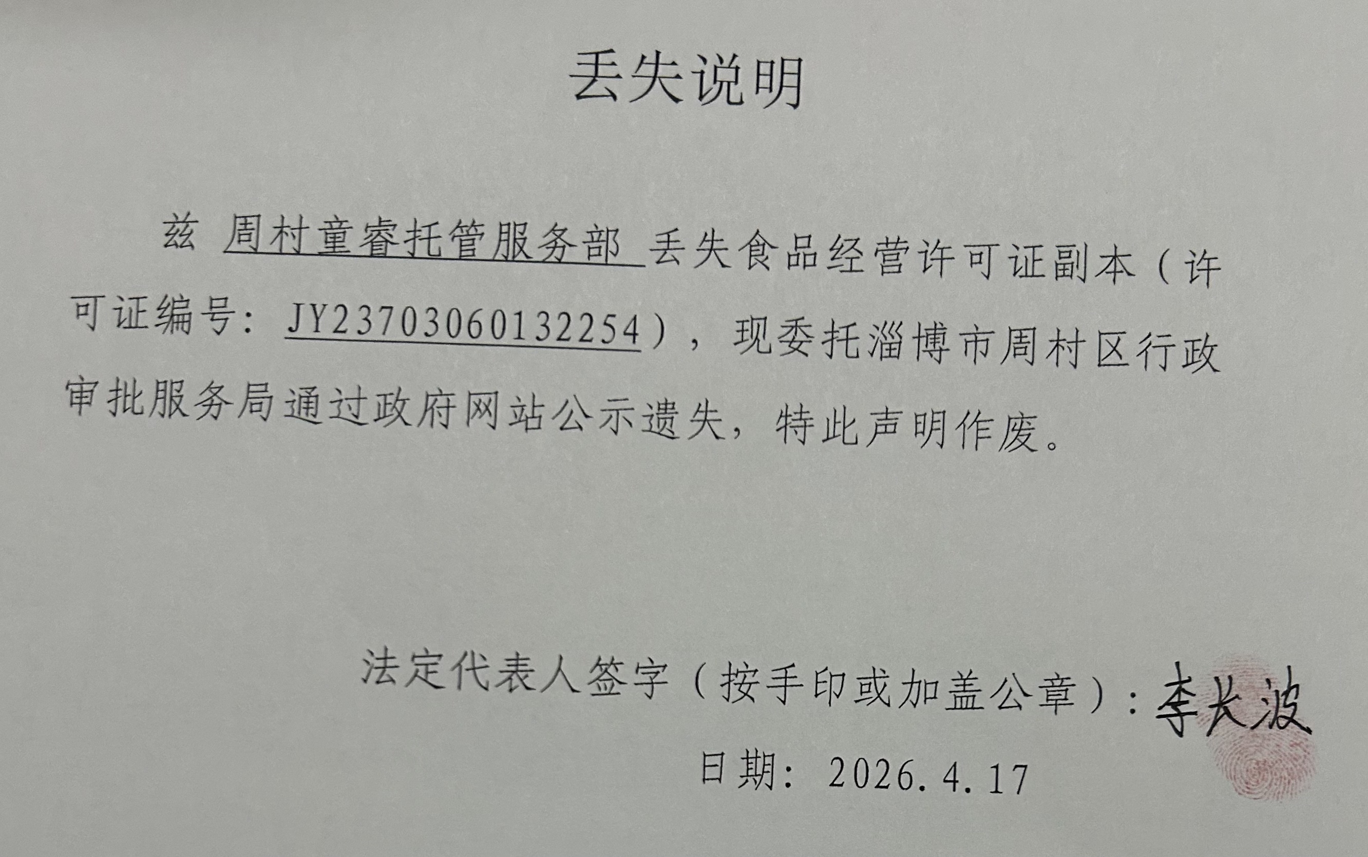 周村童睿托管服务部丢失食品经营许可证副本