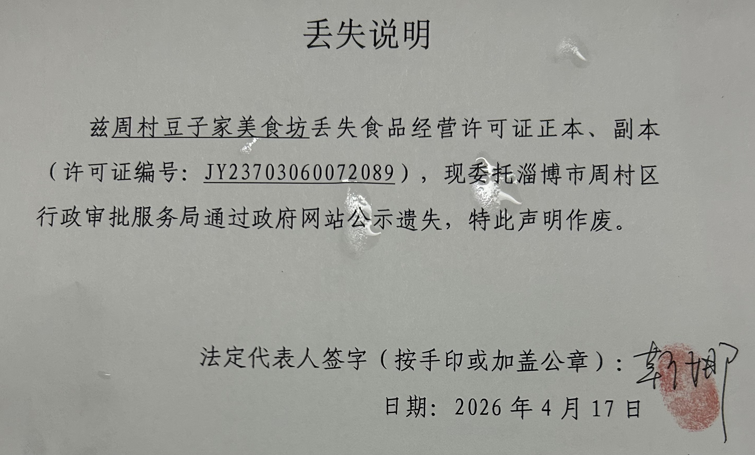 周村豆子家美食坊丢失食品经营许可证正本、副本