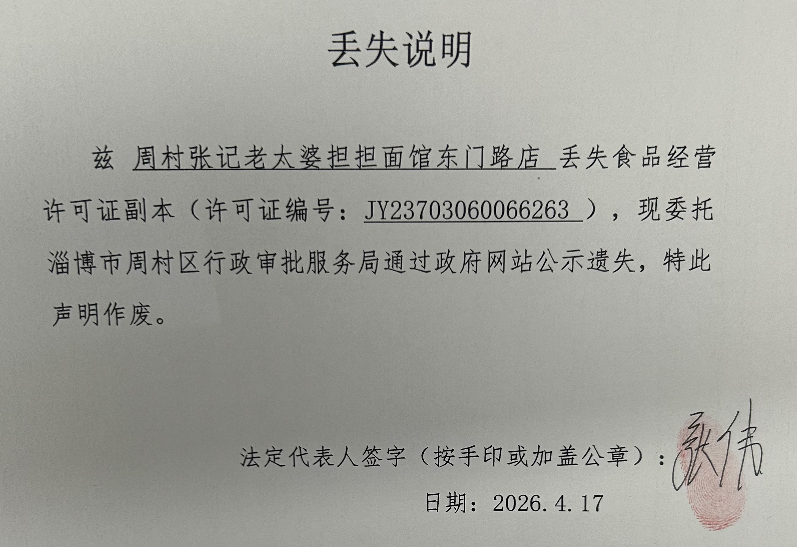 周村张记老太婆担担面馆东门路店丢失食品经营许可证副本