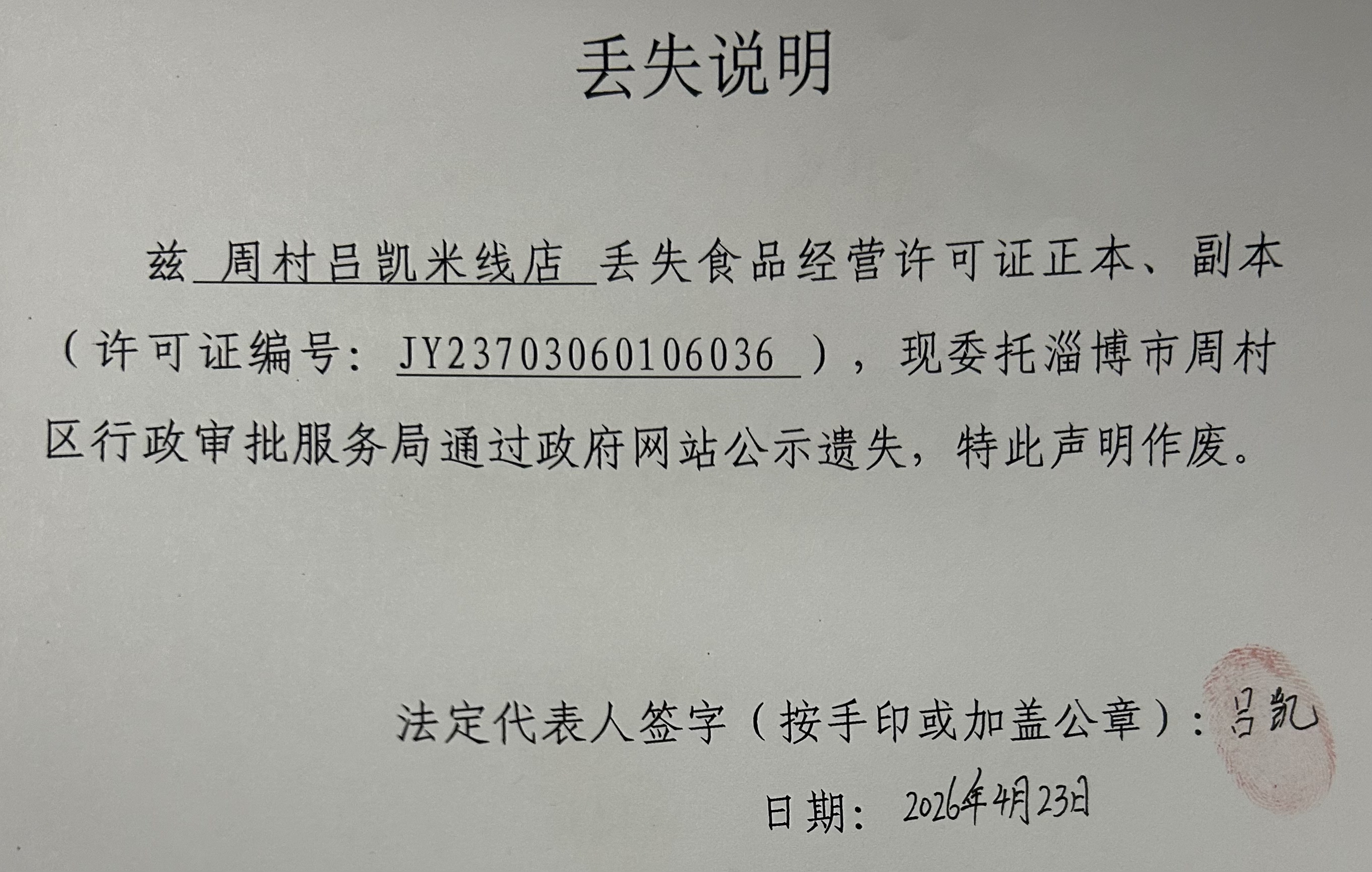 周村吕凯米线店丢失食品经营许可证正本、副本