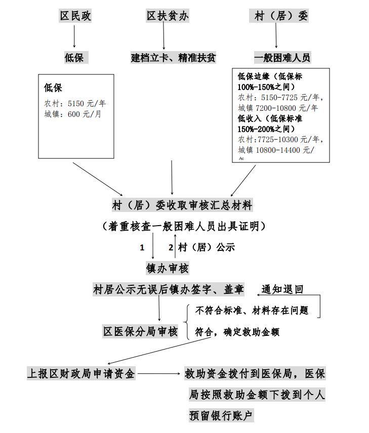 低保户,资格认定由区民政局负责;建档立卡、精准扶贫人员认定由区扶贫办负责;低保边缘家庭、低收入家庭救助对象和因病致贫家庭申请医疗救助时,申请人应持本人身份证、户口本、医保卡、医疗机构诊断依据、医疗报销单据向户籍所在村(居)委会提出申请,由所在村(居)委会进行困难人员信息核实并出具相关证明,填写申请表;经镇办审核无误后,由村(居)进行公示,公示后由镇办签字、盖章汇总报送区医保分局。