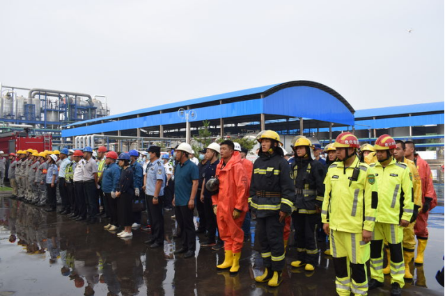 演练模拟了危化品泄露着火事故发生时的接报警、企业自救、伤员救治、人员疏散、扩大应急、罐区灭火、带压堵漏、交通管制、政府响应、部门协同等事故救援场景。120余人、10台救援车辆、2套气象、环保专业检测设备参加演练活动。各镇办、各行业企业140余人进行现场观摩。