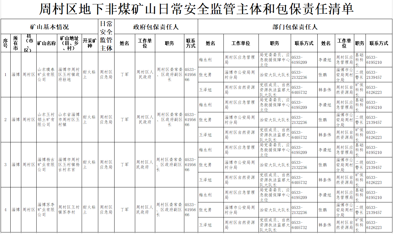 按照《国家矿山安全监察局关于进一步压实矿山安全监管监察责任切实消除监管盲区的通知》(矿安〔2021〕50号)、《山东省安全生产行政责任制规定》(省政府令第293号)、《淄博市落实国家矿山安监局矿山安全生产专项整治督导调研发现问题整改工作方案》(淄安委发〔2021〕5号)要求,进一步落实政府领导包保非煤矿山安全生产,强化部门监管责任,现将周村区非煤矿山包保责任清单予以公告