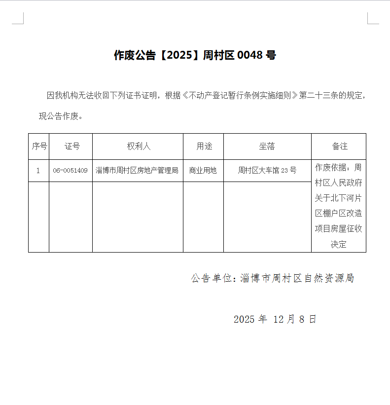 作废公告【2025】周村区0048号